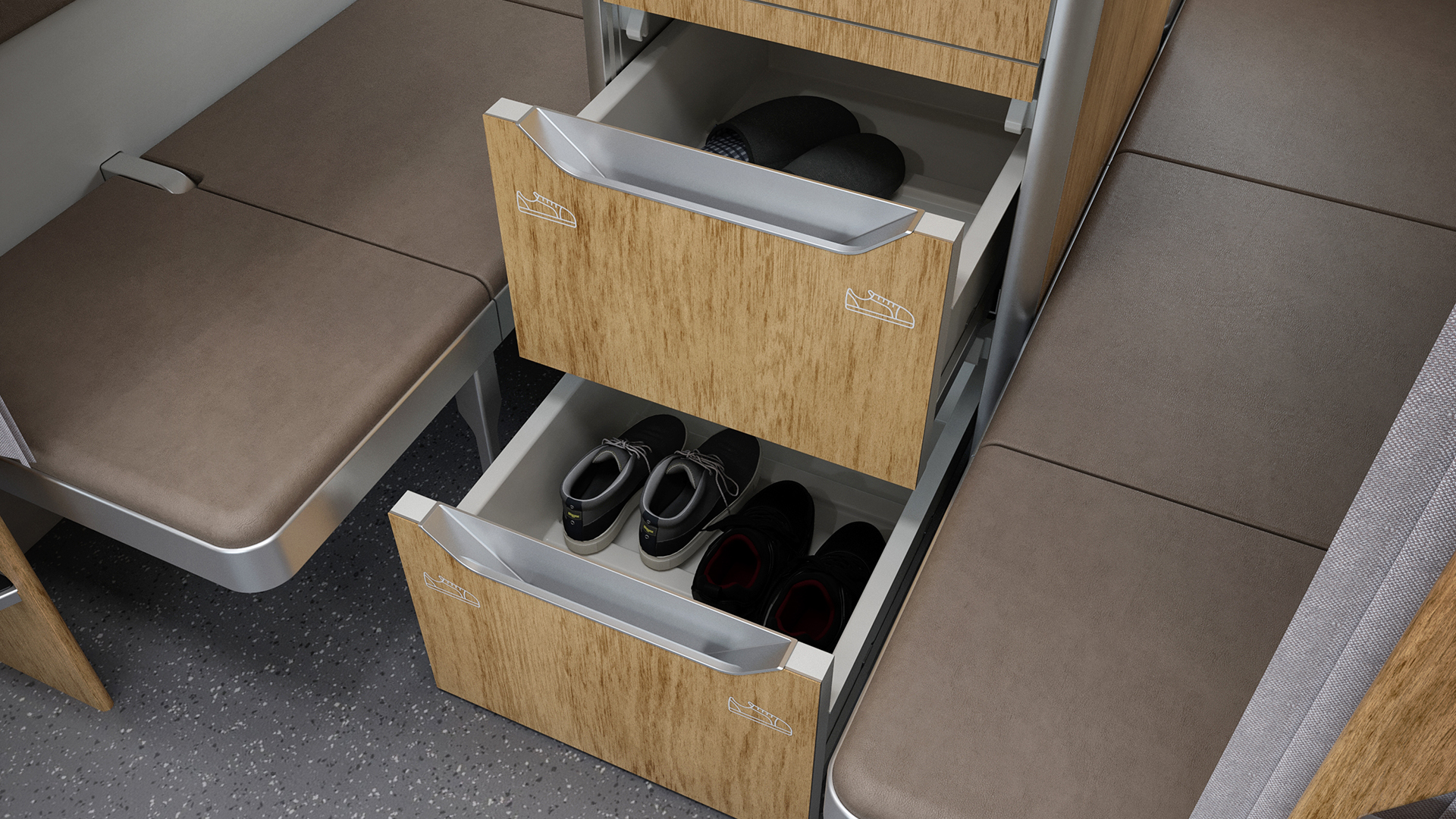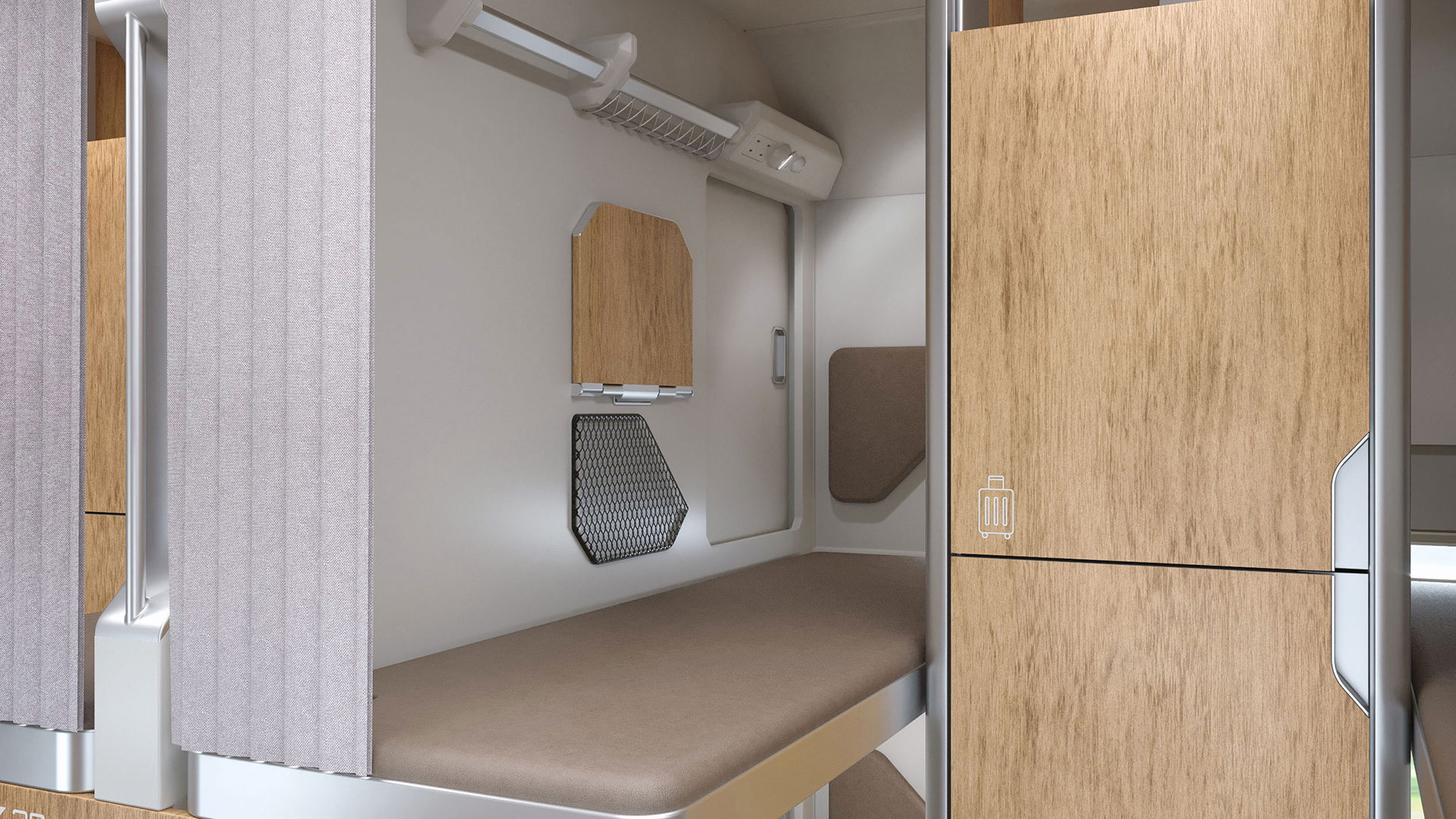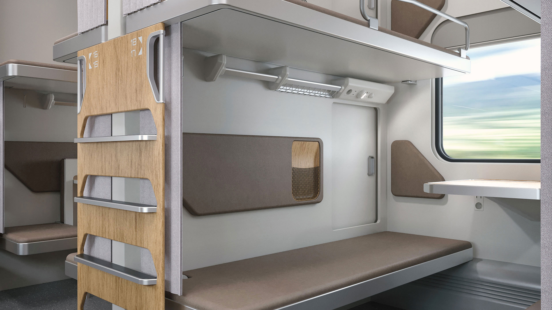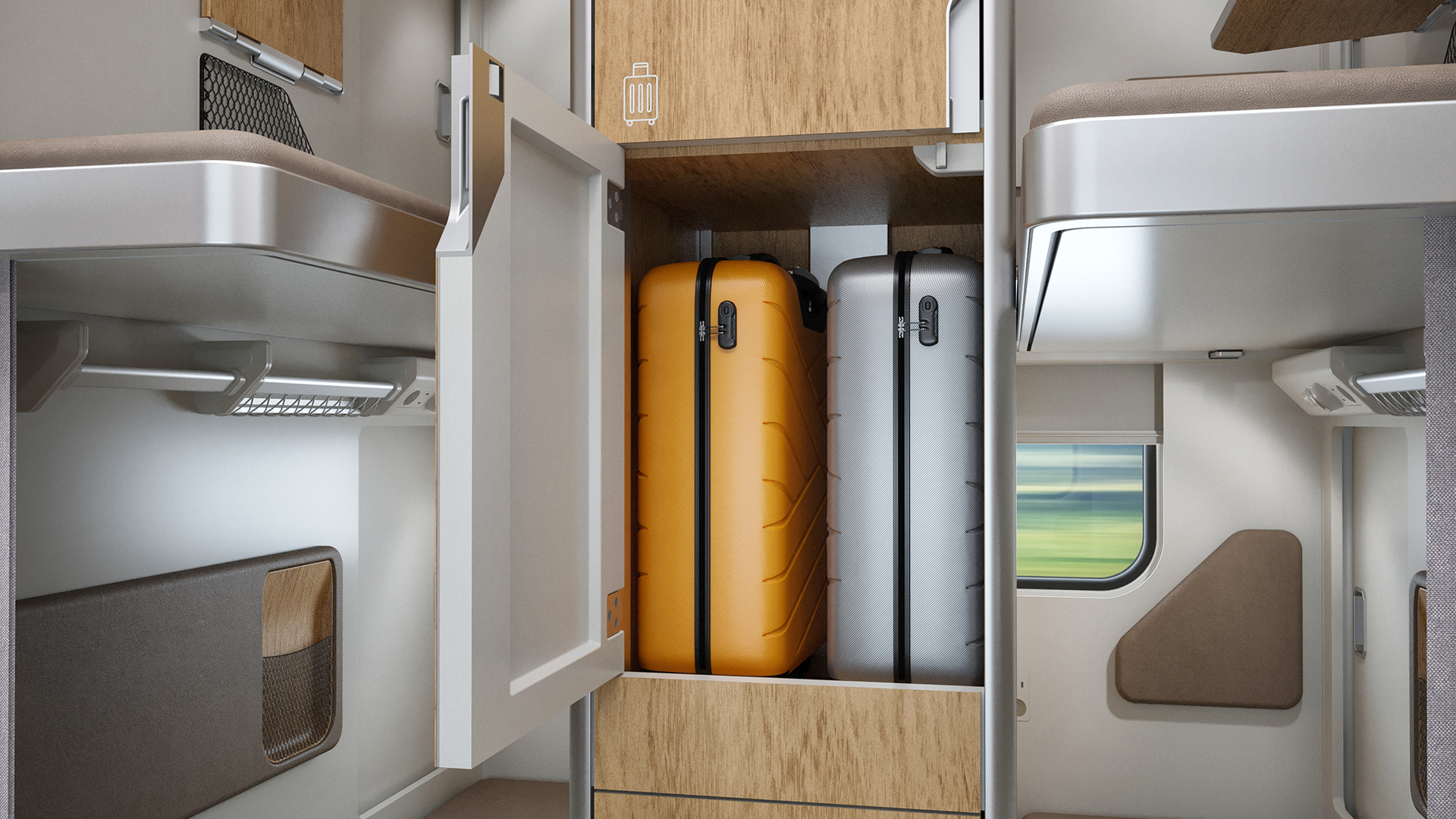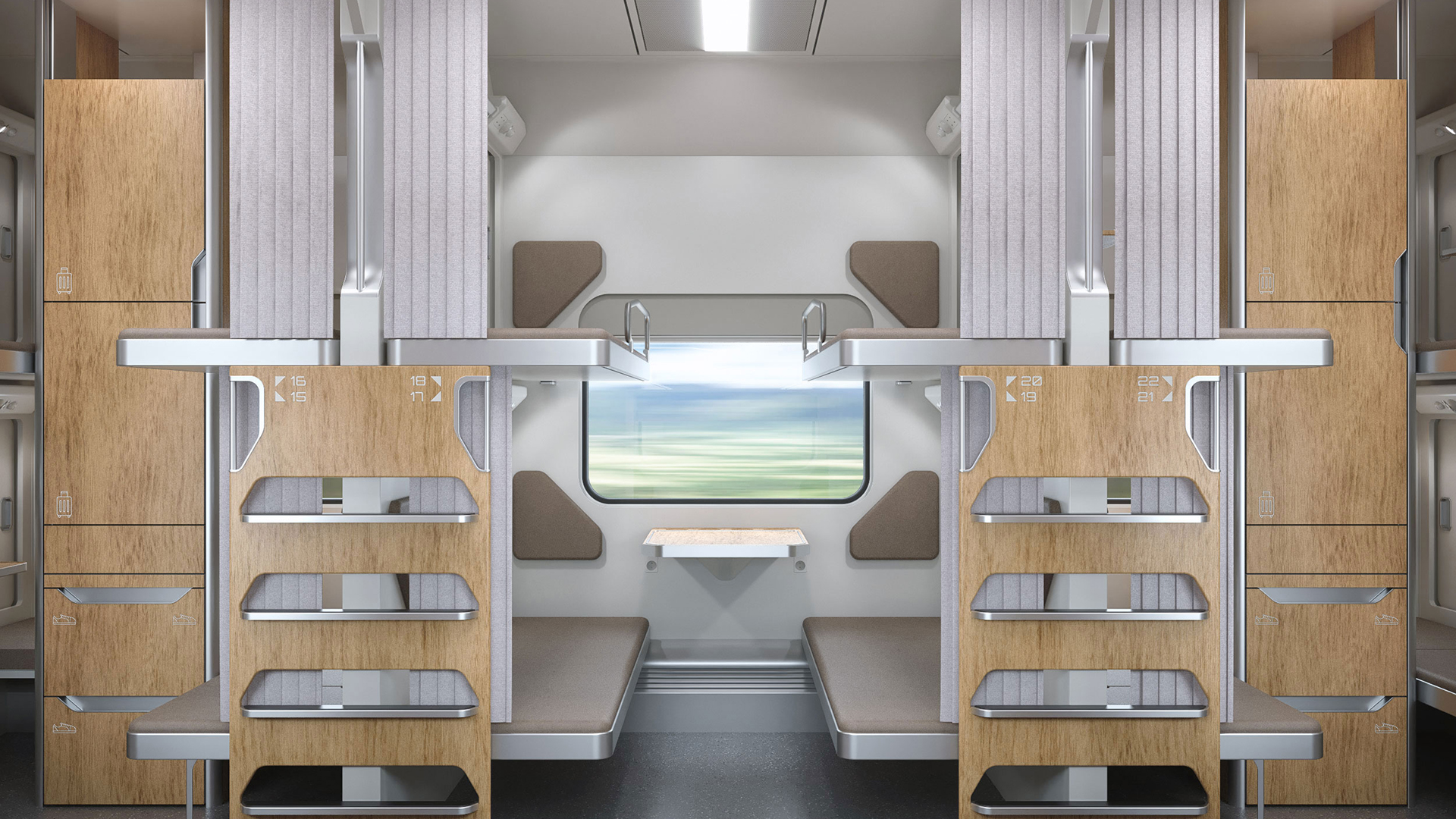 Одно из нестандартных решений – размещение в некоторых купе модульных конструкций для хранения багажа, верхней одежды, обуви. Еще несколько новшеств: возможность трансформации нижних полок в два кресла со столиком, установка окошек с двухсторонними замками в перегородке между жилыми отсеками.