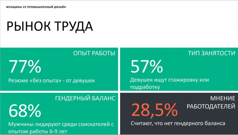 Около 80% студентов кафедр промышленного дизайна — девушки. При этом на практике оказывается, что 90% сотрудников студий — мужчины. И это характерно не только для России. По данным исследования Музея дизайна Великобритании, проведенного в 2018 г., доля женщин среди студентов, изучающих дизайн, составляет 70%, а доля женщин среди профессиональных дизайнеров — 20%.