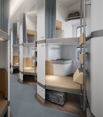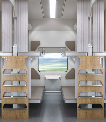 Интерьер капсульного вагона с диагональным расположением мест “Елочка”