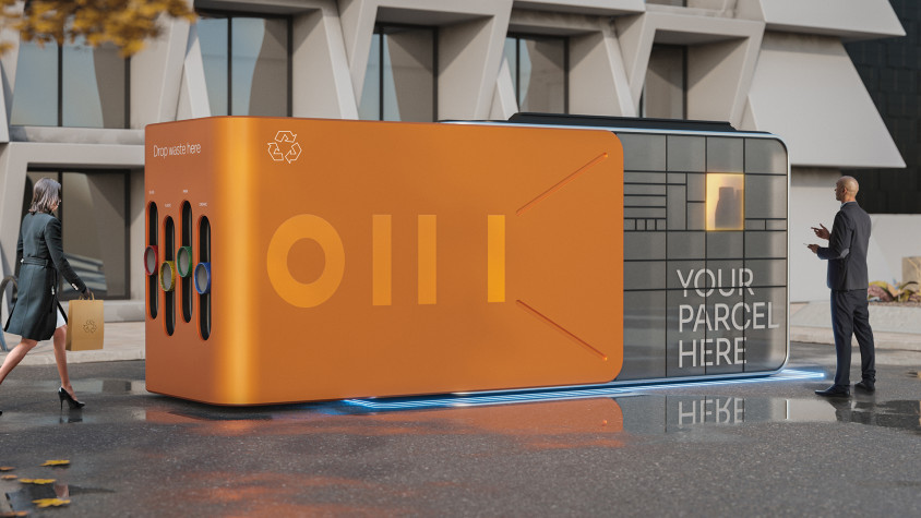 · грузовой контейнер-постамат/продуктомат с изолированными отсеками для сбора отходов (возможно, фандомат).