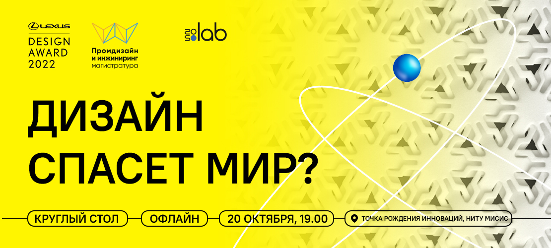 Вместе с Lexus Design Award Russia и Магистерской программой «Промдизайн и инжиниринг» НИТУ МИСиС приглашаем обсудить это на круглом столе «Дизайн спасет мир?», который состоится в рамках образовательной программы Lexus Design Award 20 октября в 19.00 в «Точке рождения инноваций» НИТУ МИСиС.
